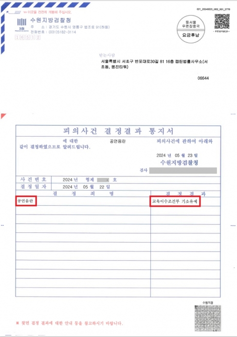 주임검사는 캡틴법률사무소의 주장을 받아들여 기존 강제추행으로 송치되었던 죄명을 공연음란으로 의율변경하고, 처분에 있어서도 기소유예 처분으로 선처해주었습니다.