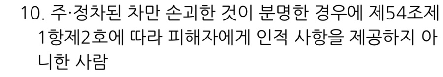 ‘도로교통법’은 주·정차된 차를 손괴한 것이 분명한 경우에 피해 차량의 소유자에게 인적 사항을 제공하여야 한다고 규정하고 있으며, 이를 제공하지 아니한 경우 20만 원 이하의 벌금이나 구류 또는 과료에 처해지도록 규정하고 있습니다.