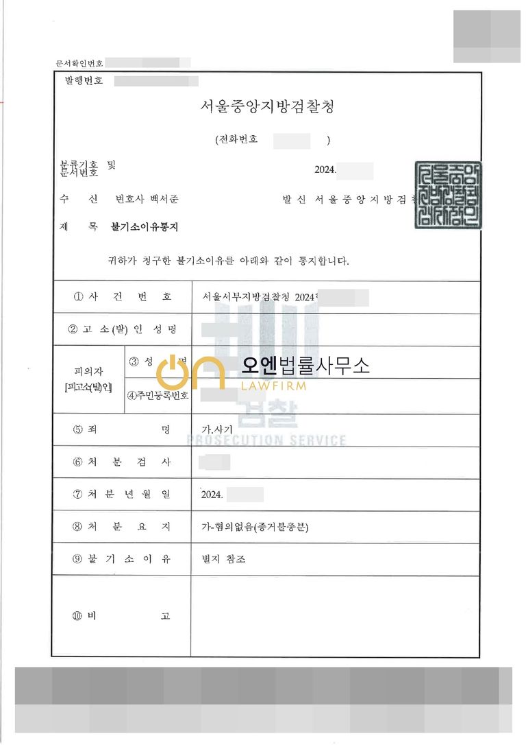 검사는 담당변호사의 의견을 받아들여 의뢰인의 불기소처분(증거불충분)을 내렸습니다.