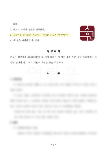 최종적으로 의뢰인은 90% 상간녀위자료 감액에 성공하였고 소송 비용 중 5/6을 원고가 부담하라는 판결까지 받아낼 수 있었습니다. (위자료 3,100만 원 중 2,600만 원 감액)