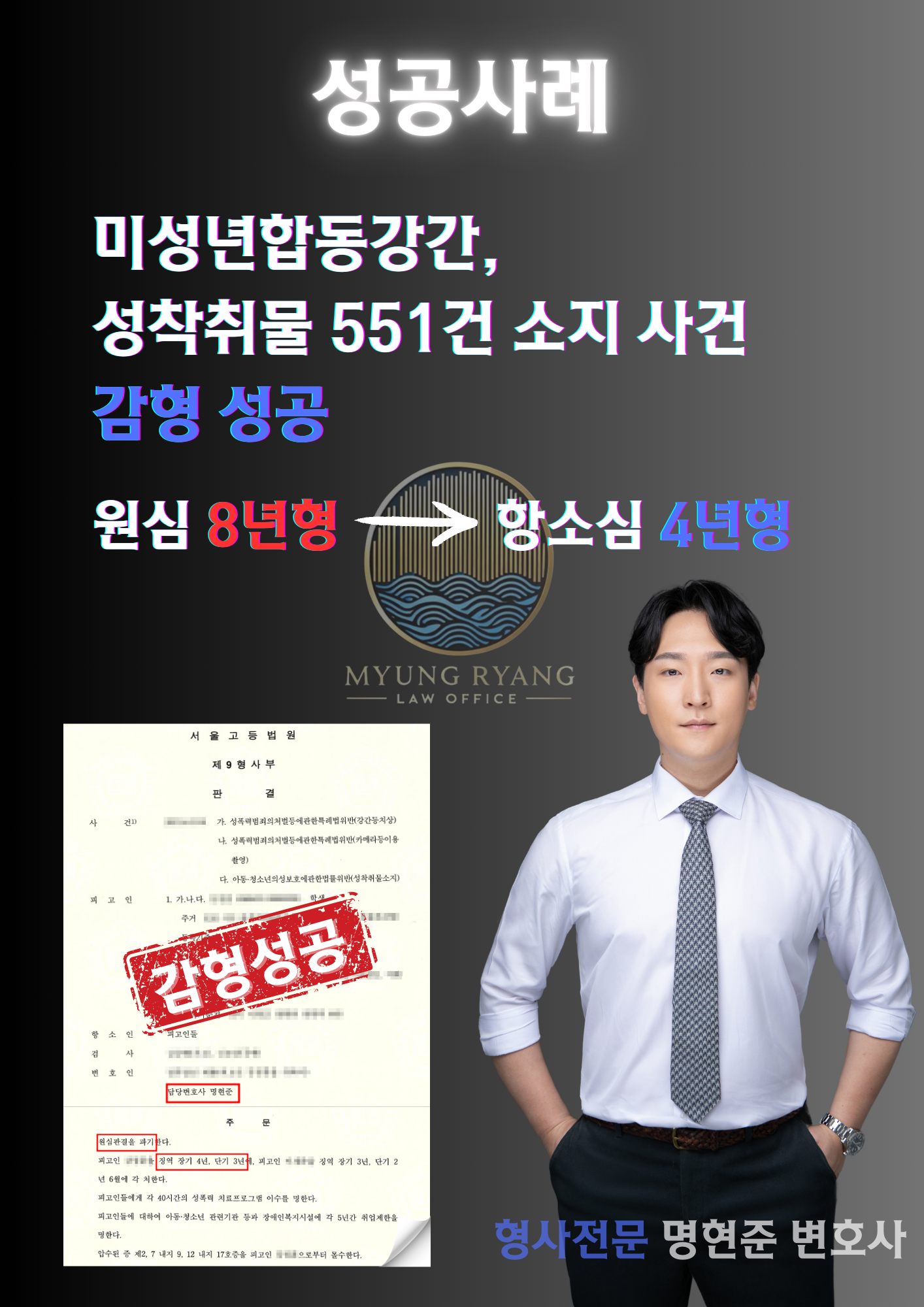 재판부는 본 변호인의 주장을 받아들여 장기 8년 형을 선고한 원심 판결을 취소하고, 4년 형으로 감형하였습니다.