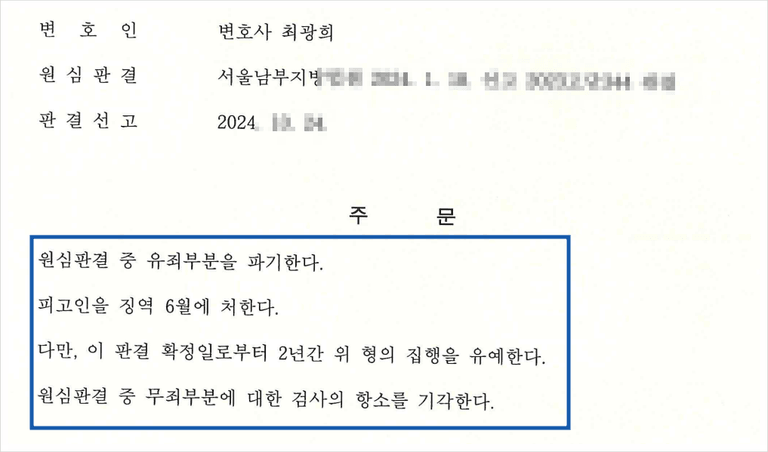 법원은 유죄부분을 파기하고 집행유예를, 원심판결 중 무죄 부분에 대한 검사의 항소에 대해서는 기각판결을 하였습니다. 의뢰인은 1심 결과 6개월의 징역을 받았으나 저를 전적으로 신뢰하여 항소심을 맡겼고, 저는 1심 결과를 면밀히 검토하며 피해자와 합의를 시도하는 한편, 항소이유에 대한 주장을 보강함으로써 집행유예라는 좋은 결과를 받을 수 있었습니다.