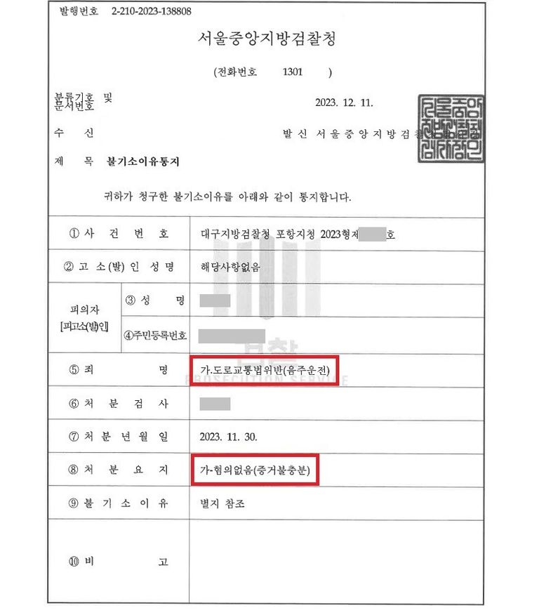 이 사건 주임검사는 캡틴법률사무소의 위와 같은 주장을 모두 받아들여 의뢰인의 음주운전 혐의에 대하여 혐의없음(증거불충분) 처분을 하였습니다.