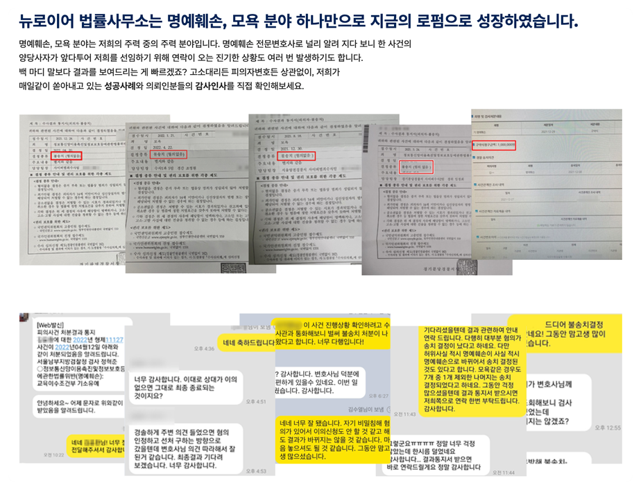 그렇기에 사이버 범죄 사건 중 명예훼손, 모욕죄는 저희가 제일 잘하는 분야라고 자신 있게 말씀드릴 수 있을 것 같은데요.