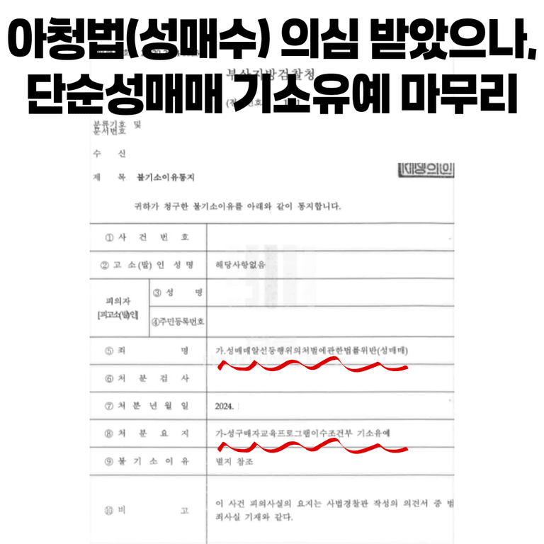 아청법위반(성매수등) 혐의로 조사를 받았으나, 변호인의 조력과 함께 단순성매매로 의율되어 교육조건부 기소유예로 마무리