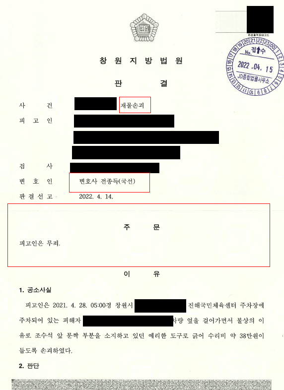cctv화면 검증절차를 진행하고, 피고인의 행동으로 말미암아 피해자 차량의 손괴가 발생할 수 없다는 점을 변호인의견서 등을 통하여 적극적으로 항변하여 무죄판결을 받은 사안입니다.