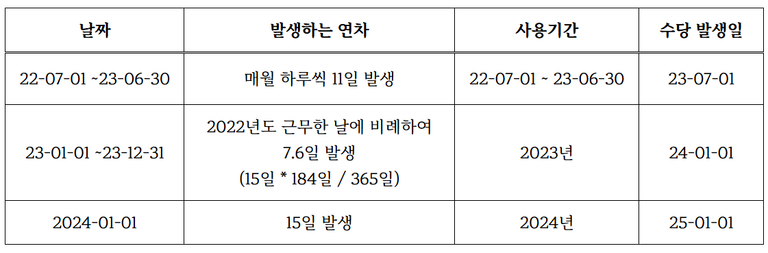 예를 들어 2022년 7월 1일에 입사했고 회계연도 기준으로 하는 회사입니다. 그럼 2023년 6월까지 11일 연차가 발생하는데, 일부 사용하지 못한 연차가 있다면 2023년 7월에 발생하는 방식입니다. 그리고 다음 해부터는 매년 1월에 연차 미사용 수당을 받으시게 되는 것입니다. 매월 1월에 임금이 좀 두둑해질 수 있는 거죠.