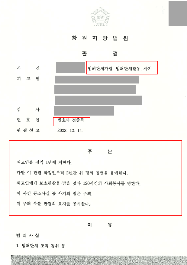 변호인은 관련자들을 전부 증인신청하여 피고인의 범죄단체활동하지 않은 사실, 보이스피싱 사기범죄에 가담하지 않은 사실을 적극적으로 항변하였고, 피고인의 양형자료를 적극적으로 제출하였습니다. 또한 관련자들의 진술 전부를 분석하여 피고인의 유죄 자료로 사용된 대부분의 증거자료의 신빙성을 탄핵하였습니다. 그리하여 피고인에 대하여 일부무죄, 집행유예 판결이 선고되어 체포구속되어 있던 피고인이 가족의 품에 돌아갈 수 있었던 사례입니다.