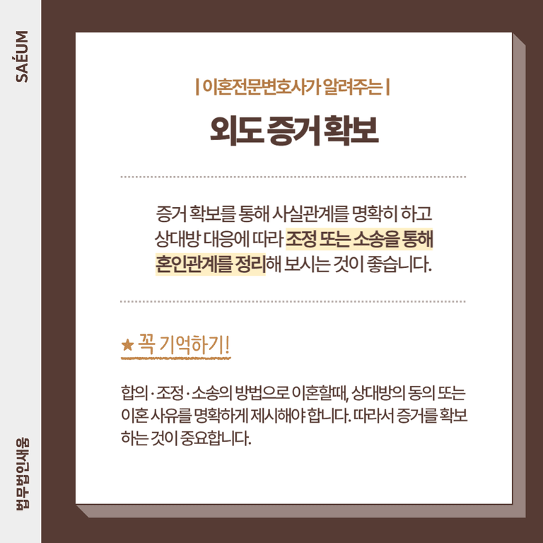 이렇게 남편 외도로 인해 고통을 받고 결국 관계가 파탄에 이르러 이혼하고자 한다면, 본인이 고통을 받고 피해를 본 것만큼 유리한 조건으로 법률혼 관계를 정리할 수 있도록 해야 합니다.