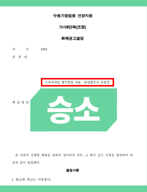 이렇게 남편 외도 및 이혼 재산분할 측면에서 유리한 부분을 잘 활용하여 조정을 이끌어낸 결과 재산분할로 1,000만 원을 즉시 받을 수 있었으며 양육비로 175만 원을 받기로 했습니다. 또한 조정을 7개월 만에 성립할 수 있도록 하여 의뢰인이 바라는 바에 따라 분쟁 없이 되도록 이른 시일 내로 관계를 정리할 수 있었습니다.