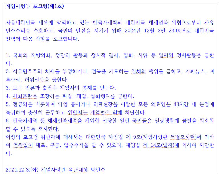 2024. 12. 3. 다음과 같은 계엄사령부 포고령이 내려졌습니다.