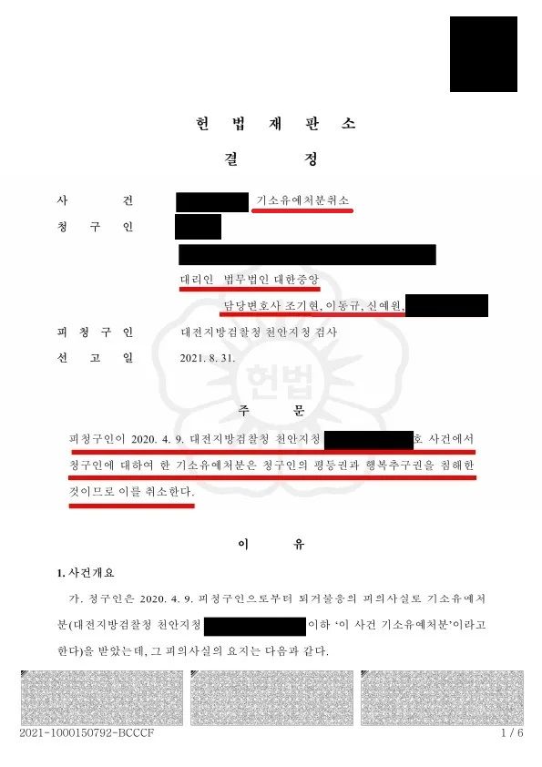 따라서 억울한 기소유예 처분은 반드시 취소하여야 하는데요, 기소유예 처분은 헌법소원심판을 통해서만 다툴 수 있고, 헌법소송은 변호사 강제주의를 채택하고 있으므로 기소유예 처분의 취소를 구하는 헌법소원심판을 청구할 때에는 변호사가 대한변협 등록 헌법재판전문변호사인지를 확인하시길 바랍니다.