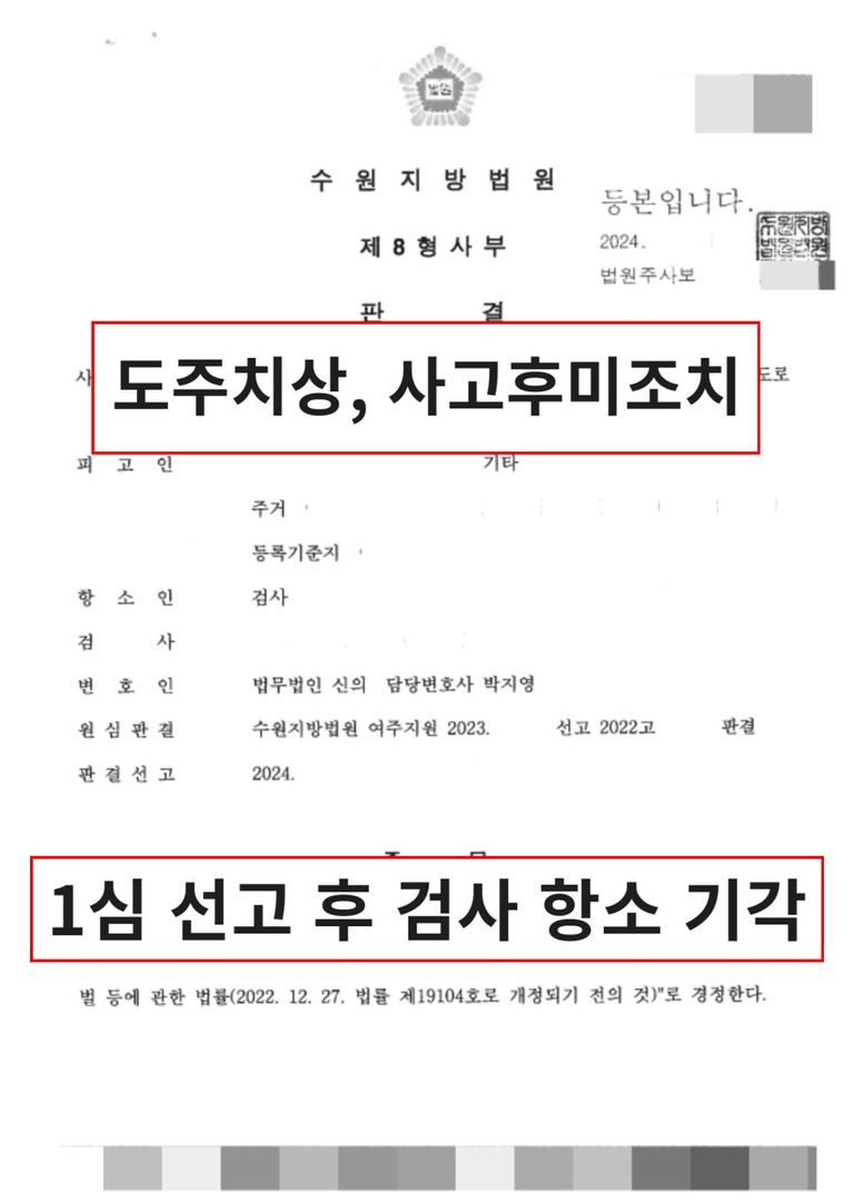 이와 같은 본 변호인의 조력으로 인해 도주치상/사고후미조치 1심 선고 후 검사항소 기각이라는 결과를 이끌어낼 수 있었습니다.