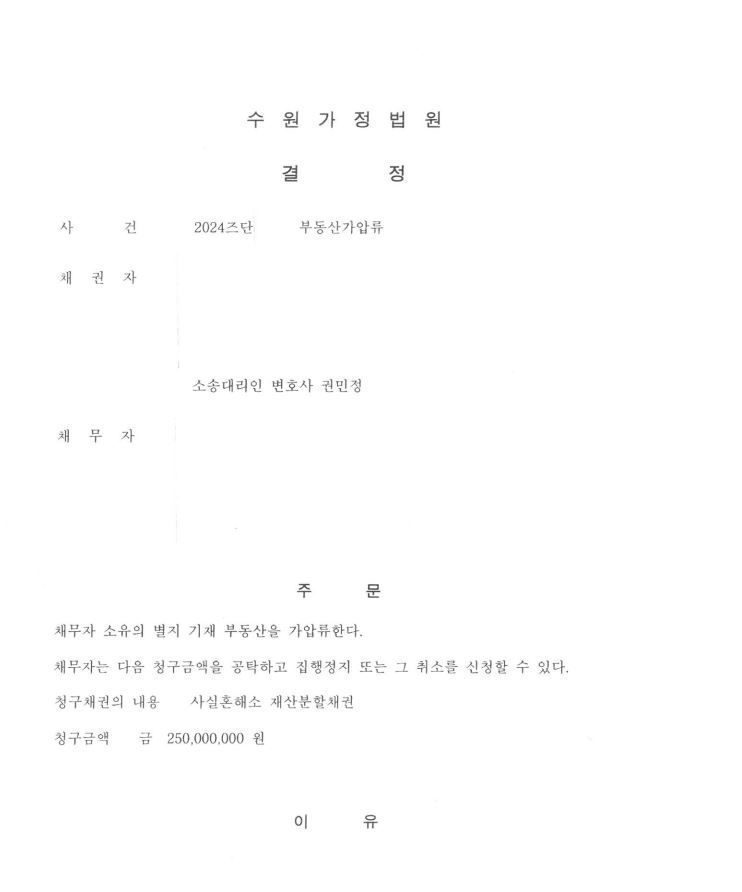 따라서 대리인의 경우 상대방과 의뢰인이 사실혼관계라는 사실, 상대방과 의뢰인의 재산내역서 등을 면밀하게 검토하여 신청서와 함께 정리제출하였습니다. 그 결과 가정법원에서는 부동산가압류결정을 내렸습니다.