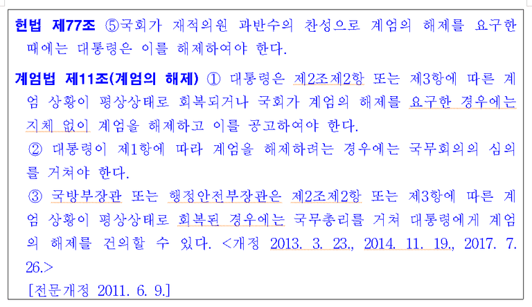 다행히, 빠른 속도로 모인 국회의원들의 정족수가 재적의원 과반수를 넘어 계엄해제안을 의결했고 이에 따라 대통령은 계엄해제를 선포했지요.