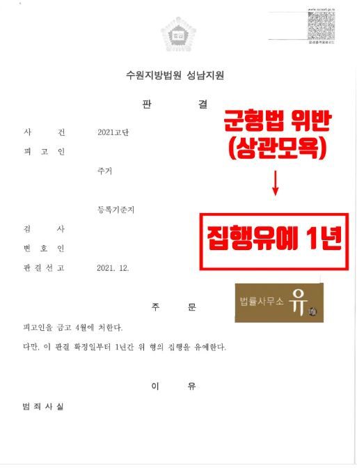수원지방법원 성남지원은 법률사무소 유의 형사전문변호사가 제출한 변호인의견서의 내용을 참작하여 법이 허용하는 한도에서 최대한 관대한 처분인 금고 4월, 집행유예 1년의 판결을 선고하였습니다.