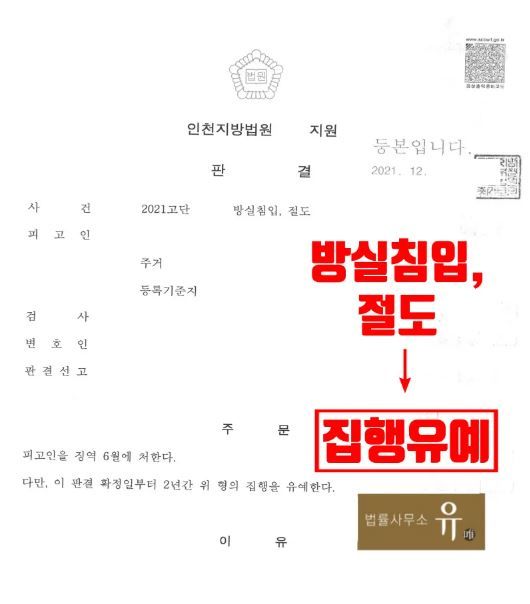 인천지방법원 부천지원은, 의뢰인이 혐의는 인정되나, 초범이고, 자신의 잘못을 인정하고 반성하는 점, 범행의 동기 및 범행 후의 정황과 양형자료 등 법률사무소 유(唯) 형사전문변호사가 제출한 변호인 의견서를 참작하여, 의뢰인에게 집행유예 판결을 선고하였습니다.