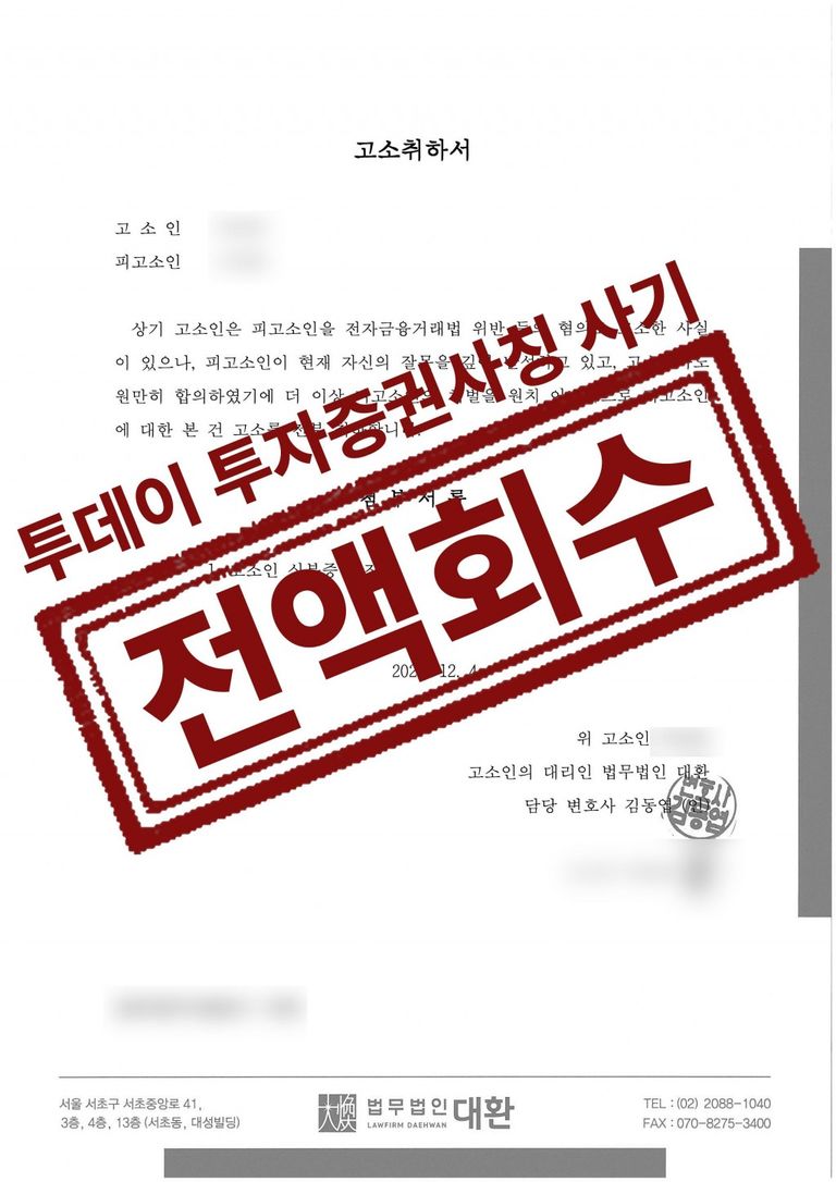 의뢰인은 투데이투자증권 사칭 사기에 당하여 약 5천만 원의 피해를 입게 되었습니다. 피의자인척 접근하고 계좌정지를 풀도록 요구하여 법무법인 대환의 변호인단은 전액을 돌려준다면 풀어주겠다고 한 사건입니다.