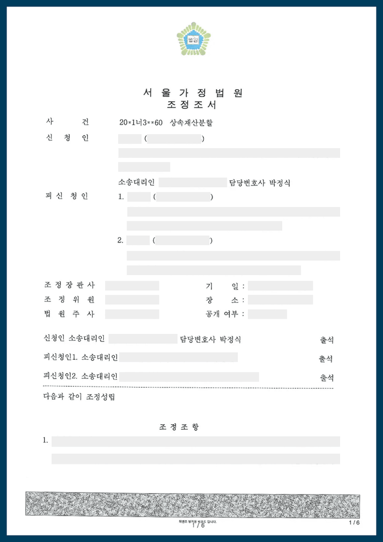 ③ 딸이 피상속인을 간병하고 부양한 기간이 불과 2~3년 정도인 점으로 보아 자녀의 부양의무를 넘어 선 특별한 부양으로 보기 어려워 딸의 기여분을 인정하기 어렵다고 판단하여, 상속재산 중 부동산은 신청인이 단독으로 소유하는 것으로 분할하고, 금융재산은 1/3씩 분할하고, 신청인이 부동산 가액의 1/3에 해당하는 가액을 피신청인들에게 각 지급하는 것으로 조정이 성립된 사안입니다.