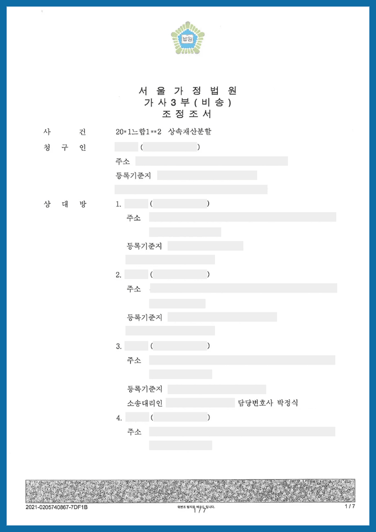 이에 상속재산 중 부동산을 상속인들이 개별적으로 소유하는 것으로 분할하고, 각 상속인별로 그 차액을 산정하여 상속인들 사이에서 차액에 해당하는 금액을 각 지급하는 것으로 조정이 성립된 사안입니다.