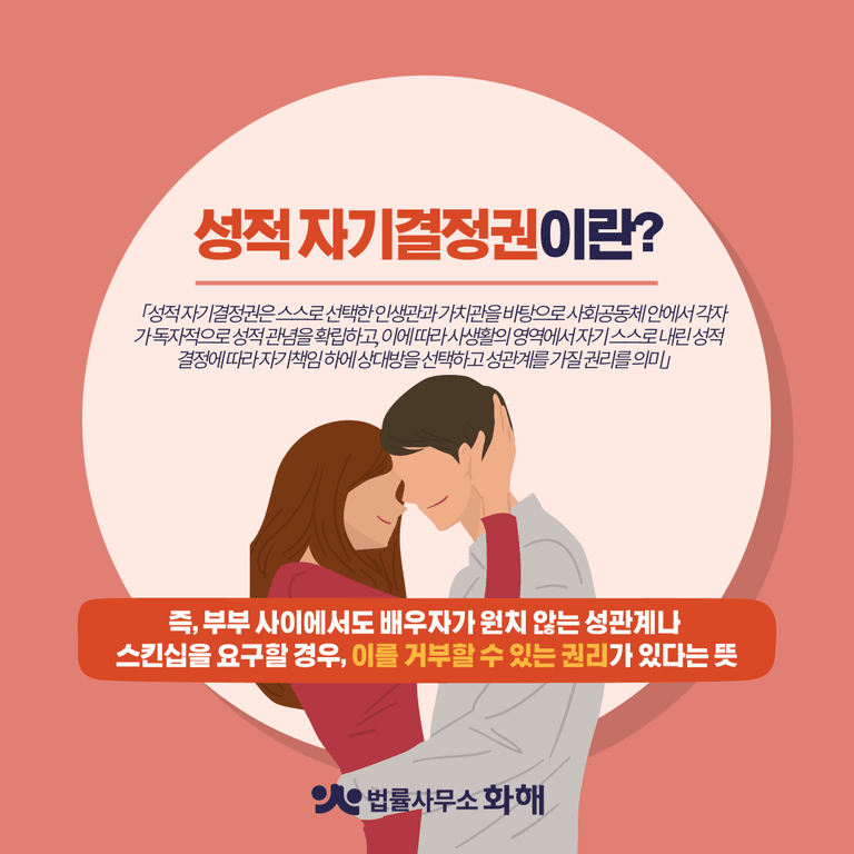 즉, 부부 사이에서도 배우자가 원치 않는 성관계나 스킨십을 요구할 경우, 이를 거부할 수 있는 권리가 있다는 뜻인데요. 따라서 ‘결혼’이란 서로의 성적 권리를 포기하는 것이 아니라 각자의 성적 자율성을 존중하는 일이며, 부부 간에도 서로의 의사를 존중하여 건강한 성적 관계를 유지하는 것이 중요할 것입니다.