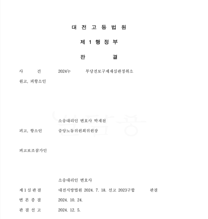 이에 대해 중앙노동위원회위원장은 항소하여 항소심이 진행되었습니다. 피고와 피고 보조참가인 직원은 원고의 처분이 부당하다고 다투었으나 원고를 대리한 저는 직원의 회사 내 행위가 전직처분을 할 수 밖에 없는 행위였고, 회사의 대표에게 인사재량권이 존중되어야 한다는 주장을 펼쳐 항소심 또한 승소하게 되었습니다.