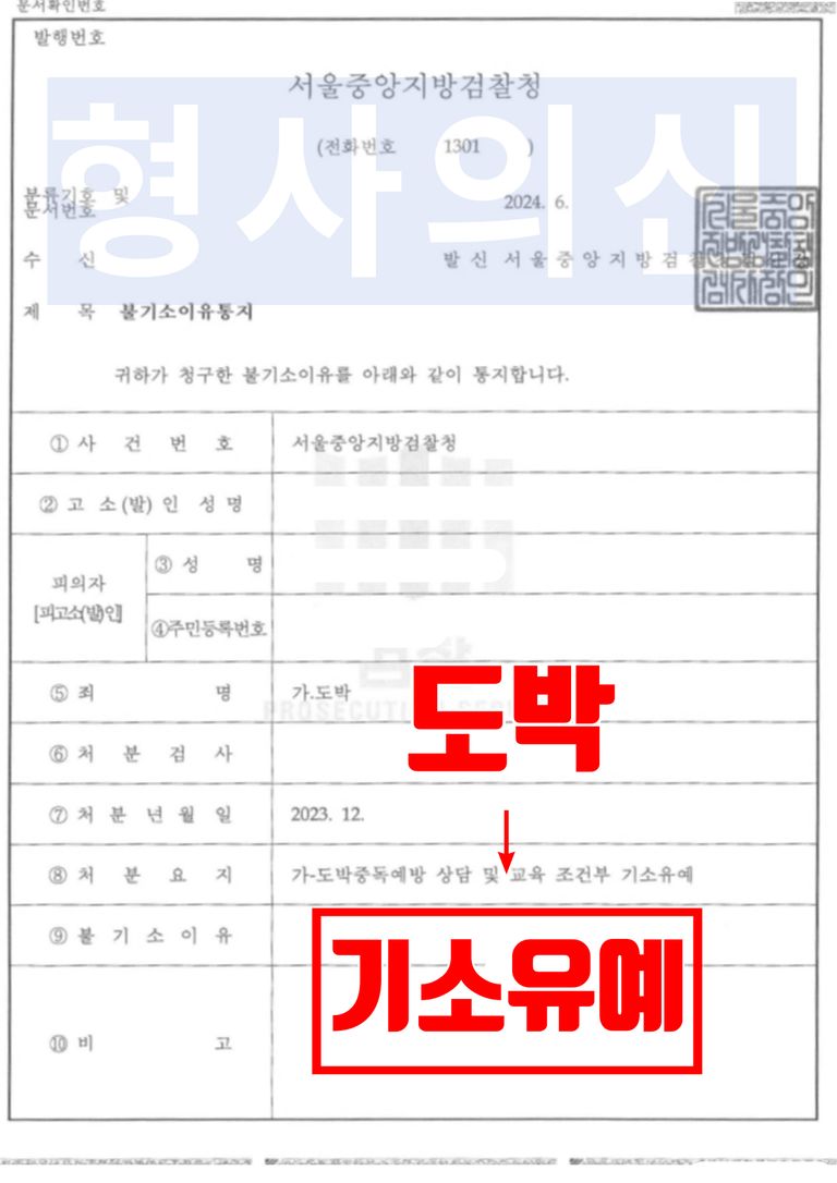 서울중앙지방검찰청 검사는 법률사무소 유(唯)의 형사전문변호사가 제출한 변호인의견서 및 양형자료 등을 받아들여, 의뢰인이 초범으로 범행을 인정하며 반성하고 있는 점, 도금으로 총액이 불분명하고 서울보호관찰소에서 실시하는 도박중독예방 상담 및 교육에 참가하여 성실히 이수할 것을 다짐하고 있다는 점 등을 유리한 정상으로 보아‘불기소(교육조건부 기소유예)’결정을 하였습니다.