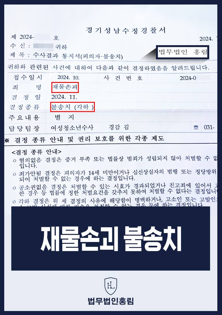 그 결과 경찰 측에서는 변호인의 의견을 받아들여 '불송치' 처분으로 사건을 종결하였습니다.