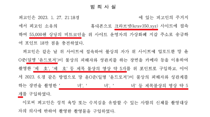 A씨는 2023. 1. 27. 21:18경 '크라브넷' 사이트에서 55,000원 상당의 비트코인으로 충전하여 제○○호, ○○○○녀 등의 불법촬영물을 구매하였습니다.