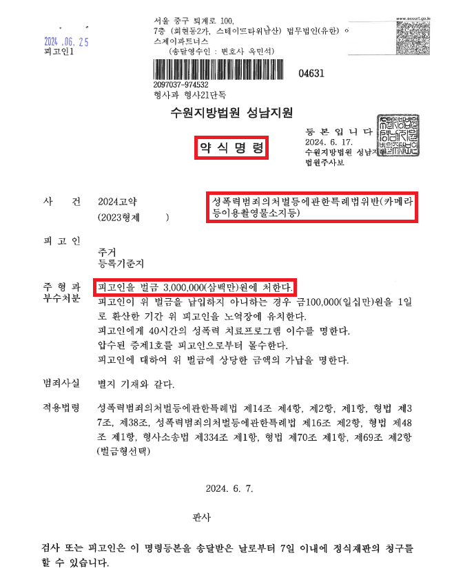 이러한 저의 조력을 바탕으로 A씨는 최근 '윤XXX' 사건은 대부분 구공판되고 있음에도 불구하고 약식명령으로 벌금형을 선고받음으로써 재판까지 나아가지 않고 사건을 신속하게 마무리할 수 있었습니다.
