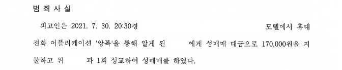 A씨는 2021. 7. 30. 20:30경 랜덤 채팅 어플리케이션 '앙톡'을 통해 성매매 여성 B씨를 만나 170,000원을 지불하고 성매매를 하였습니다.