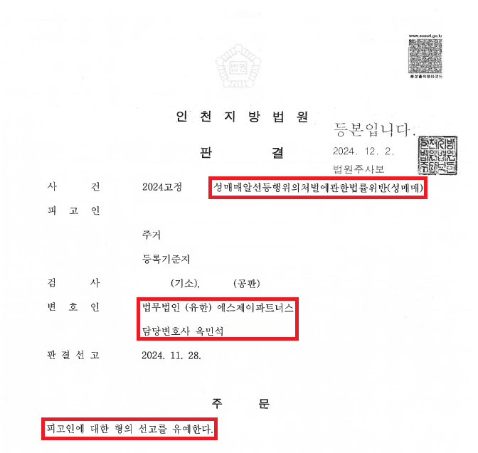 이러한 저의 조력을 바탕으로 A씨는 2년이 경과하면 면소된 것으로 간주되는 '선고유예'를 받음으로써 성매매 전과자가 될 위기에서 벗어날 수 있었습니다.