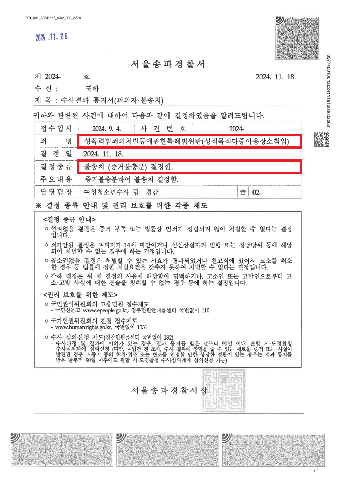 이러한 저의 조력을 바탕으로 A씨는 초기에 잘못 대응하여 성범죄자로 몰리는 상황이었음에도 불구하고 '불송치(혐의없음)' 결정을 받음으로써 억울한 누명에서 벗어날 수 있었습니다.