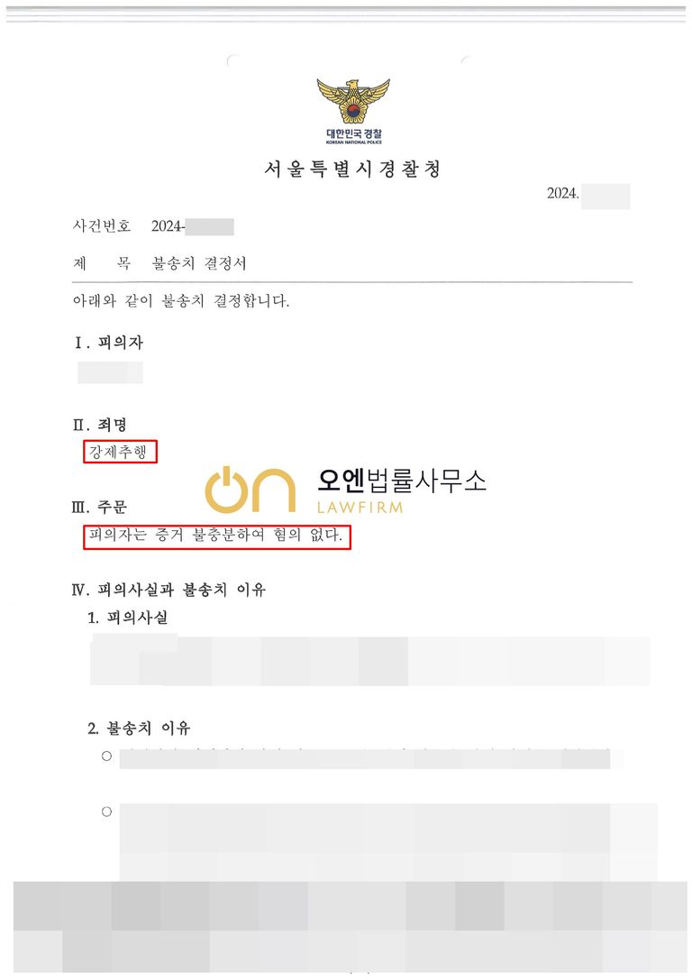 경찰은 이러한 변호인의 주장을 받아들여 죄명을 강제추행으로 변경하고 혐의없음의 불송치 결정을 하였습니다.