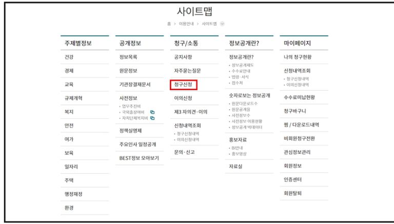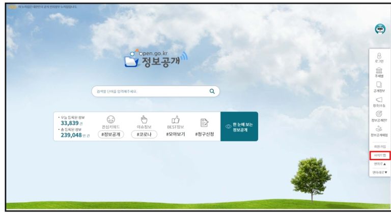 1. 정보공개포털(www.open.go.kr) 접속하여 ‘사이트맵’ 클릭