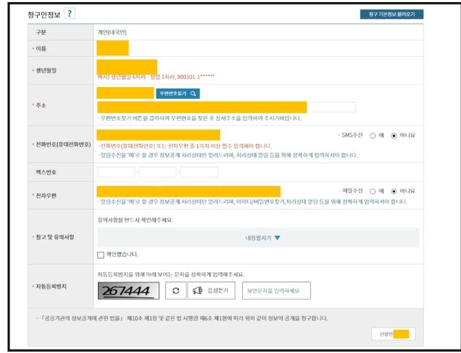 7. 청구인정보 확인·수정 및 참고 및 유의사항확인, 보안문자입력