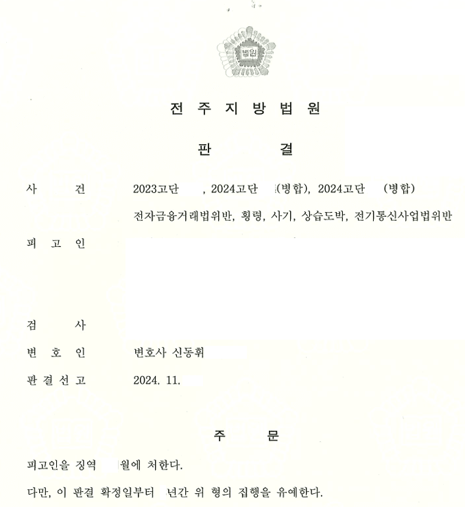 전자금융거래법위반, 횡령, 사기, 상습도박, 전기통신사업법위반 사건 진행 결과 징역형의 집행유예를 받은 소식을 전해드립니다.