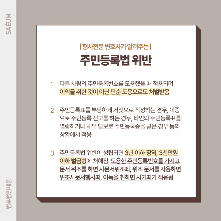 사문서위조 및 위조사문서행사죄도 무거운 처벌이 내려오지만, 주민등록법 위반도 그에 못지않게 중형이 내려오게 될 수 있습니다. 주민등록법 위반은 다른 이의 주민등록번호를 도용했을 때 적용이 되는 범죄인데요.