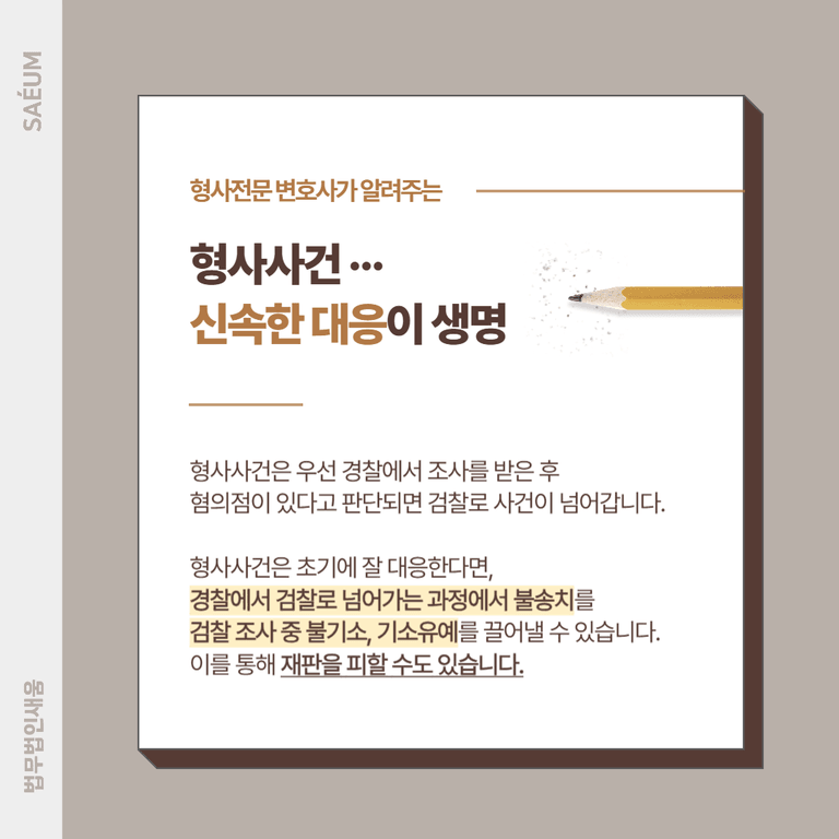 그렇기에 초기에 대응한다면 경찰에서 검찰로 넘어가는 과정에서 불송치를 이끌어내는 것이 가능하며, 이외에도 검찰 조사 과정에서 불기소, 기소유예 등의 결과를 이끌어낼 가능성이 커지게 되며, 이를 통해 재판을 피하는 것도 가능합니다.