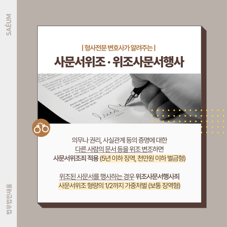 계약이나 혹은 기타 사적인 공적인 문서를 허위로 작성하거나 혹은 위조하는 등의 행위를 하는 경우 법적인 처벌을 받게 될 수 있습니다. 사문서위조의 경우 가벼이 생각하는 분들도 많은데, 이와 같은 거짓된 문서를 제작하고 사용하면 법적인 문제가 커질 수 있으며 악용의 가능성이 상당하여서 사문서위조 및 위조사문서행사죄로 강력한 처벌을 하고 있습니다. 문제가 커질 수 있기에 신속하게 대응하는 것이 좋습니다.