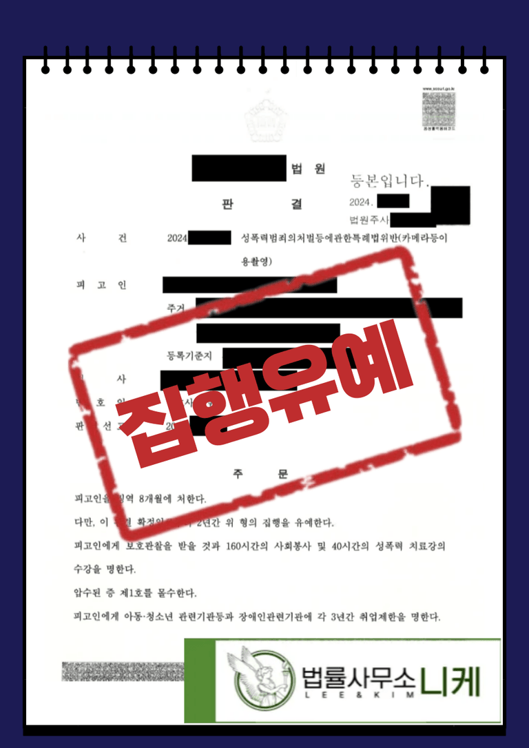 그 결과 의뢰인은 성폭력범죄의처벌등에관한특례법위반(카메라등이용촬영) 혐의를 받고 법정형으로 최대 7년의 징역형을 선고받을 수 있었음에도 불구하고 집행유예 처분을 받을 수 있었습니다.