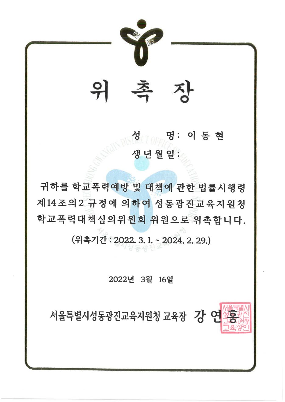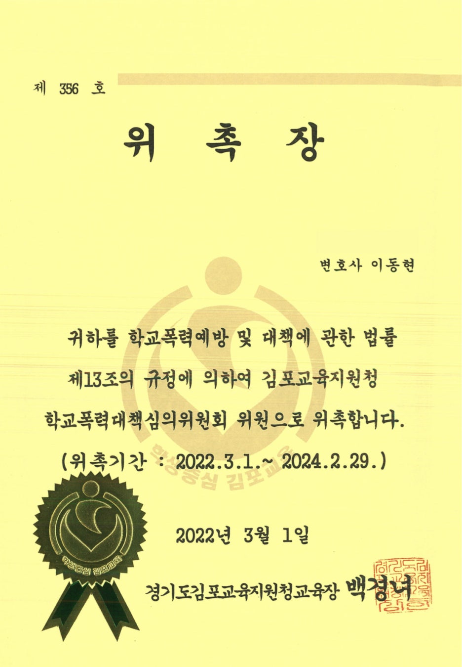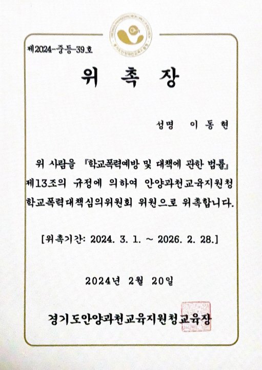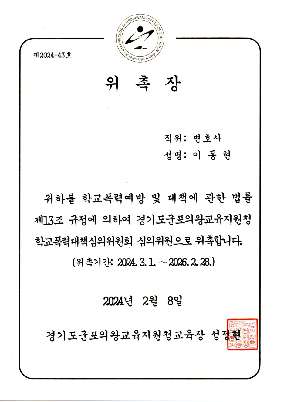 안녕하세요, 저는 법무법인 에스제이파트너스의 파트너 변호사로, 학교폭력대책심의위원회 위원장이자, 수백 건의 학교폭력 사건에서 '학교폭력에 해당하지 않음', '조치사항 없음', '3호 이하의 조치' 등 많은 좋은 결과를 도출해 낸 [대한변호사협회 정식등록 학교폭력전문변호사] 의왕학교폭력전문변호사 이동현변호사입니다.