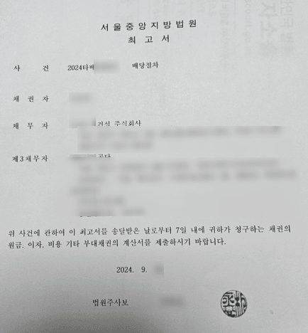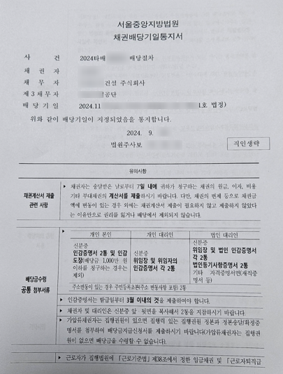배당기일통지서 및 최고서는 아래와 같은 양식으로 의뢰인께 송달되었습니다.