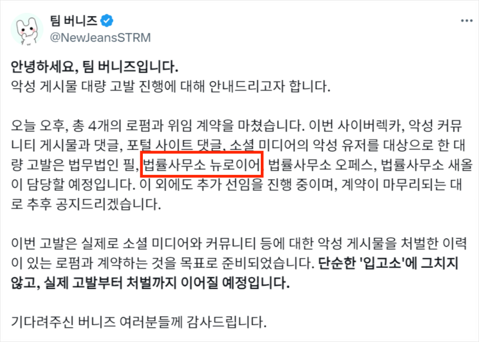 최근에는 뉴진스 악플고발 등 유명 아이돌 대량 고소 사건까지 담당하기도 하였는데요.
