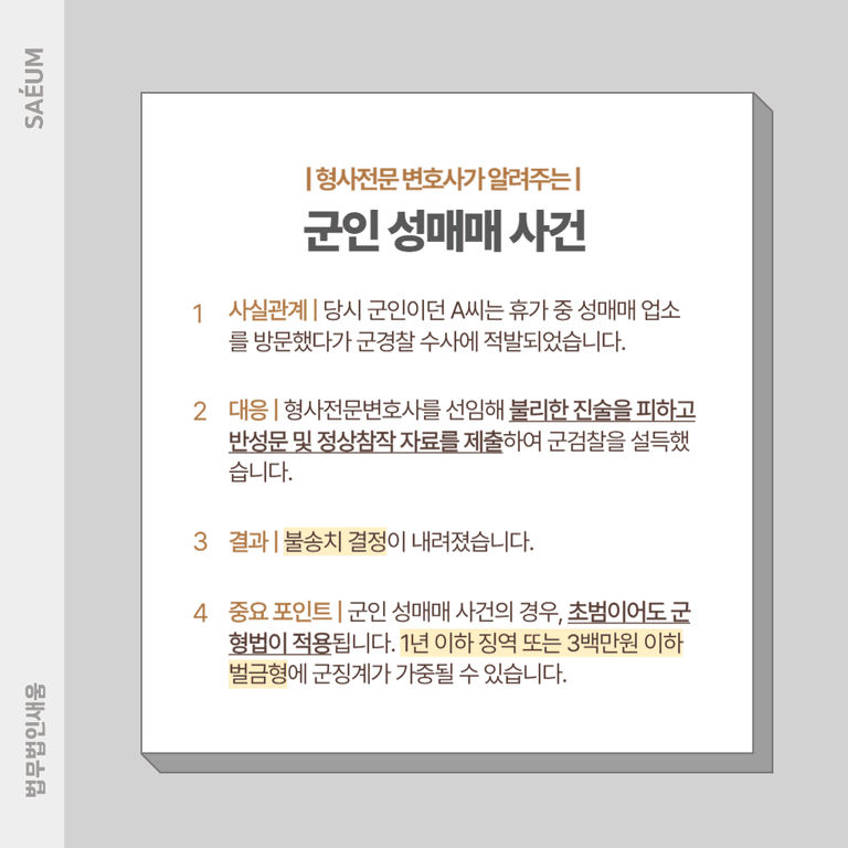 A씨는 군생활을 하던 병사로 휴가 중에 음주를 즐기다가 성을 매수하는 업소를 찾았습니다. 이후에 곧바로 복귀하였는데요. 해당 업소가 성을 매도한 사실이 적발되면서 군경찰의 수사를 받게 되었습니다.