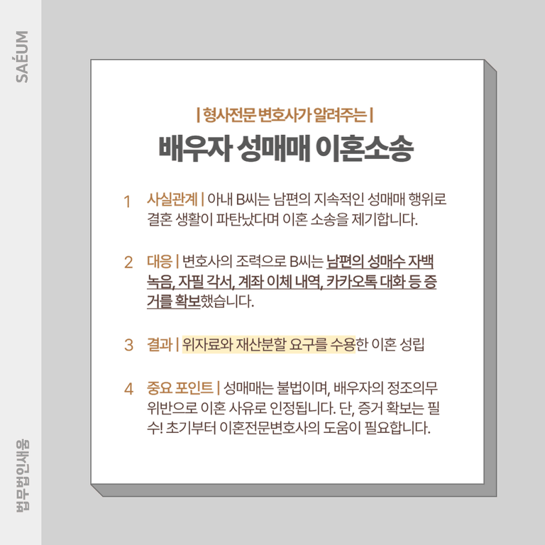 변호사는 남편의 성매수 증거들을 확보한다면 충분히 이혼의 사유가 된다고 설명하였습니다. 이에 B씨는 법적 도움을 받아 배우자의 자백 녹음 파일, 자필 각서, 업소에 돈을 이체한 내역, 카카오톡 대화 내역 등을 확보하였습니다. 해당 증거를 토대로 성매매 처벌에 이를 위기에 놓인 남편은 결국 B씨의 요구대로 위자료와 재산을 지급하여 이혼에 이르렀습니다.