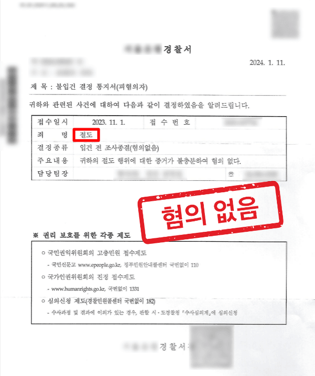 오늘은 절도혐의로 신고된 의뢰인을 변호하여 불입건 결정을 얻어낸 사례를 소개하고자 합니다.