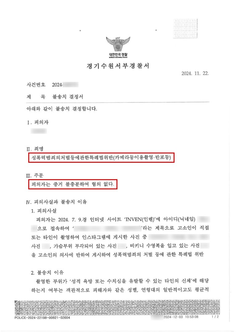 ※ 이후 모욕죄와 관련해서는 고소인이 범죄가 되지 않을 것이라 생각했는지 중간에 고소 취하를 하였고, 최종 불송치 결정은 성폭법위반죄에 대하여만 받게 되었습니다.