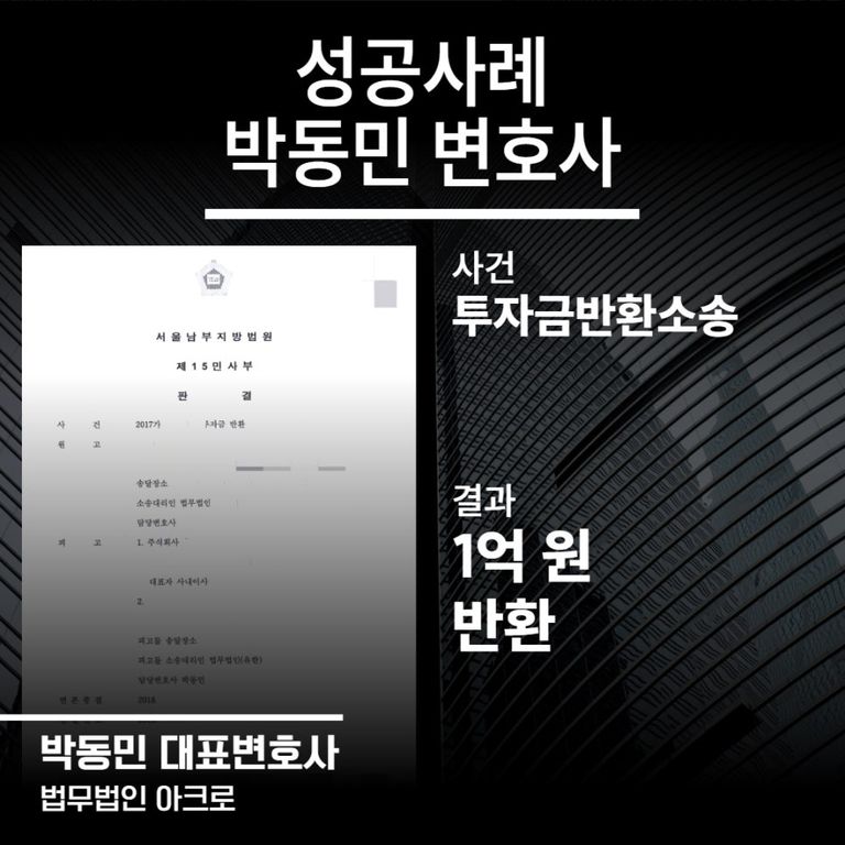 따라서, 지금부터 “투자금반환소송, 법원에서 ‘1억원’ 인정받은 성공사례”를 소개해 드릴 테니, 이 글을 읽어보시고, 도움이 필요하시다면, “민사 전문 박동민 변호사”에게 상담을 요청하셔서 법적인 조력을 받으시길 바랍니다.