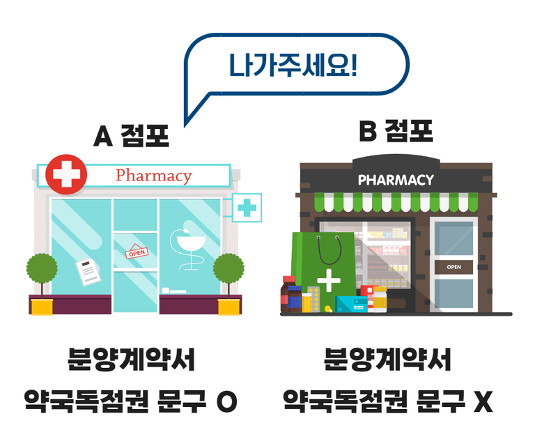 위 사례에서 A점포에 약국독점이 인정되기 위해서는, B점포의 분양계약서에도 "A점포 외에는 약국을 운영할 수 없다"는 취지의 문구가 있어야 합니다.